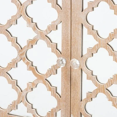 The Leah storage cabinet offers a timeless and dazzling solution to your organizational needs. Made in China, the Leah is fitted with excellent storage capability in the form of one drawer and one compartment behind a set of doors. Mirrored surfaces are accented with whitewashed brown wood framed in a quatrefoil design for a look that brightens any room. Clear crystal knobs add a touch of glamour, while turned legs lend a classic look. Fully assembled, a striking design and functional utility make the Leah cabinet a remarkable addition to any space. Dimensions: 31.9″ high x 29.5″ wide x 14.2″ deep; Drawer dimensions: 6.7″ high x 24.4″ wide x 12.2″ deep; Legs: 3.9″ high; Inner shelf: 25.6″ wide x 13.4″ deep x 16.9″ high;