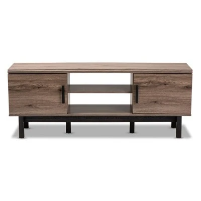 Clean lines and a display of natural wood grains make the Arend TV stand a cool addition to any space. This solid MDF wood stand is fitted with two open shelves to store DVD players, game consoles, and more. Additional storage space is provided by four shelves concealed behind a pair of doors. A stunning oak finish showcases the natural grain patterns of the wood, giving the piece a rustic touch. Dark ebony wood legs and black metal handles complete the look. The Arend TV stand is made in Malaysia and requires assembly. Dimensions: 23″ High x 59.6″ Wide x 15.7″ Deep; Left&Right Upper Shelves: 6.5″ High x 18″ Wide x 11.75″ Deep; Middle Shelves: 6.5″ High x 21″ Wide x 13″ Deep; Legs: 7.5″ High