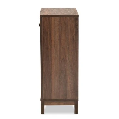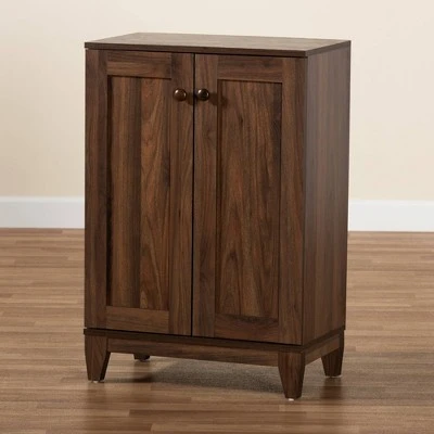 Add sleek, contemporary storage to your entryway with the stunning Nissa shoe cabinet. Made in Malaysia, the Nissa is comprised of sturdy wood showcasing a warm walnut brown finish. The Nissa is equipped with three internal shelves, providing space for around nine pairs of shoes, depending on size. Smooth, round knobs provide easy access. Requiring assembly, inset paneling on the doors lend depth and elegance. Organize your home with the handy and striking Nissa shoe cabinet. Dimensions: 34.6″ High x 23.6″ Wide x 13″ Deep; Top Shelf: 9.1″ High x 22.3″ Wide x 11.3″ Deep; Middle Shelf: 8.7″ High x 22.3″ Wide x 11.3″ Deep; Bottom Shelf: 9.1″ High x 22.3″ Wide x 11.3″ Deep; Legs: 3.5″ High;