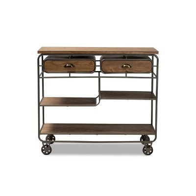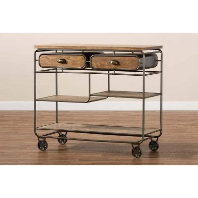 Easily enhance your dining space with the fantastic utility and vintage industrial charm of the Grant kitchen cart. Made in China, the Grant is constructed from black finished metal and oak brown finished wood for a unique, rustic look. In addition to its spacious rectangular tabletop, the Grant is equipped with two drawers and three open shelves to store plates and glassware. Fully assembled, the cart is fitted with four caster wheels for smooth, easy mobility. The Grant kitchen cart offers a visually appealing way to reorganize any kitchen or dining room, making it an excellent addition to the modern home.