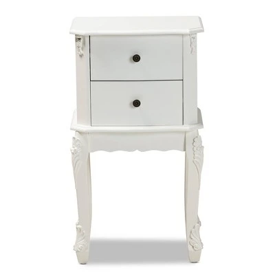 Elevate your interior with the quiet elegance of the Sophia end table. Made in China, the Sophia is fitted with two drawers to provide plenty of space for household necessities. Clean angles and stylish molding decorate the Sophia for a classic look that complements its convenient design. The Sophia requires assembly and features engraved metallic knobs for an added touch of glamour. Cabriole legs complete the look, making the Sophia a functional and stylish fit for any arrangement. Dimensions: 29.9″ high x 16.5″ wide x 12.6″ deep; Drawer dimensions: 4.7″ high x 12.6″ wide x 9.4″ deep; Legs: 12.6″ high;