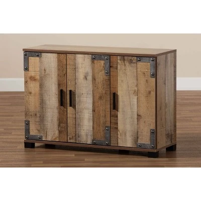 Combining elements of both industrial and farmhouse design, the Cyrille shoe cabinet is a unique addition to any entryway. Made in Malaysia, this wooden shoe cabinet features a rustic finish, giving the piece a cozy, old-world feel. Six shelves provide space to store up to 12 pairs of shoes. Antique silver finished metal corner brackets accentuated with studs lend an industrial touch, while long handles and block feet convey contemporary style. Requiring assembly, the Cyrille shoe cabinet is the answer to all your shoe storage needs. Dimensions: 24.8″ high x 35.4″ wide x 12.8″ deep; Legs: 1.5″ high;
