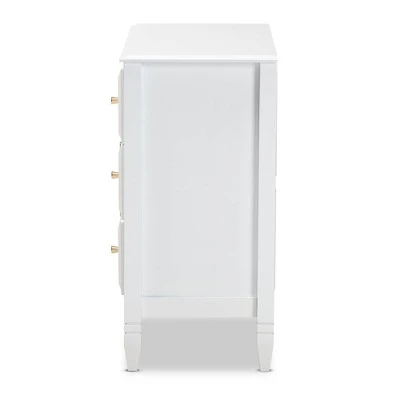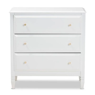 A classic silhouette receives a glamorous update in the Naomi chest. Made in Malaysia, this wooden chest displays a polished white finish that brightens any space. The tabletop is well suited for a lamp and trinkets, while three drawers provide ample storage space for clothing and linens. Each drawer is adorned with a striking gold-tone knob that adds a touch of glamour. Inspired by traditional design, the Naomi features tapered feet with recessed detailing. Requiring assembly, the Naomi chest strikes the optimal balance between classic and contemporary for a look that enhances any bedroom.