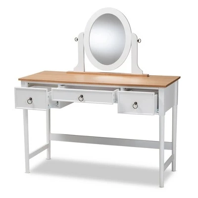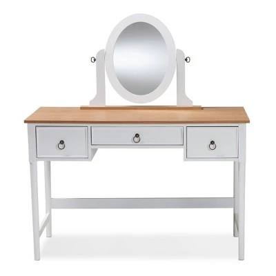 Create a relaxing space for your morning routine with the Sylvie vanity table. This traditional vanity features a spacious tabletop and three drawers with storage space for cosmetics, hair tools, and more. Additional convenience is provided by an adjustable mirror that can be rotated to any angle needed. The simple, elegant design is elevated by inset paneling on the drawers and bronze metal drawer ring pulls. Constructed from MDF wood and solid pine wood, the Sylvie is sure to become an heirloom piece. The Sylvie vanity table is made in China and requires assembly.