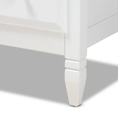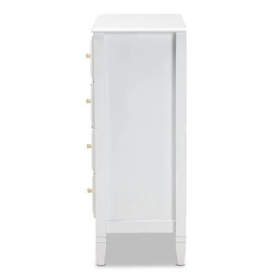 A classic silhouette receives a glamorous update in the Naomi chest. Made in Malaysia, this wooden chest displays a polished white finish that brightens any space. The tabletop is well suited for a lamp and trinkets, while four drawers provide ample storage space for clothing and linens. Each drawer is adorned with a striking gold-tone knob that adds a touch of glamour. Inspired by traditional design, the Naomi features tapered feet with recessed detailing. Requiring assembly, the Naomi chest strikes the optimal balance between classic and contemporary for a look that enhances any bedroom.