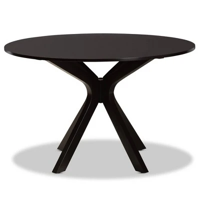 Sleek curves and a rich finish define the Kenji dining table. Made in Malaysia, the Kenji is built from sturdy wood and comfortably seats up to six. An espresso brown finish and round tabletop give the table a sleek, contemporary look while also providing ample elbow room for each member of the table. Splayed legs form a unique sculptural base, creating a chic profile from any angle. Requiring assembly, the Kenji dining table is well suited for both casual and formal dining.