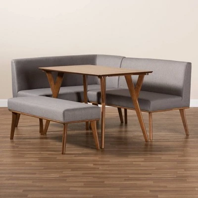 Utilize your dining space in the most stylish and efficient way with the Odessa dining nook set. Made in Malaysia, the set includes one table, one armless bench, one corner bench, and one backless bench. Each piece is constructed from sturdy wood in a walnut brown finish that complements the gray fabric upholstery on the seating. A unique marriage of mid-century design with modern minimalism, the pieces showcase angled legs. The Odessa requires assembly and is designed to be placed in the corner of your kitchen or dining area, allowing you to maximize your space while still maintaining a chic set-up. Offering both stunning style and casual comfort, the Odessa dining nook set instantly elevates any area.