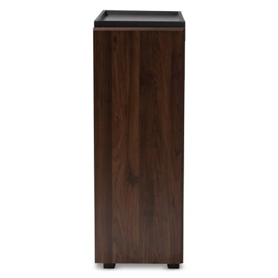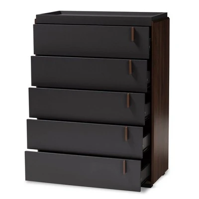 Keep your bedroom organized with the Rikke chest. Constructed from solid particle board, the Rikke features a two-tone gray and walnut brown finish for a cool, contemporary feel. Five spacious drawers provide room to store clothes, linens, and more. Each drawer is fitted with metal glides for smooth movement. Long, vertical brown PVC drawer handles add a sleek touch. Pair this stylish chest with the other bedroom pieces in the Rikke collection to complete the look. The Rikke chest is made in Malaysia and requires assembly. Dimensions: 33.5″ High x 32.3″ Wide x 15.7″ Deep; Drawer: 4″ High x 30.1″ Wide x 14″ Deep; Legs: 1.2″ High