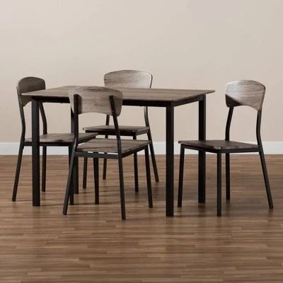 Smooth and functional, the Marcus dining set gives any dining space a relaxed, casual feel. Made in China, the Marcus set is adorned with wood finished in an oak brown and comfortably sits up to four. This dining set is supported by sturdy, black finished metal that complements the lighter tones of the wood. Assembly is required and a long, rectangular tabletop offers plenty of elbow room for each person. A unique fusion of metal and wood craftsmanship create a striking contrast that allows the Marcus to stand out as a fixture of the dining room. Table Dimensions: 29.5″ high x 43.3″ wide x 27.6″ deep; Legs: 28.5″ high; Chairs Dimensions: 32.3″ high x 17.5″ wide x 18.1″ deep; Seating dimensions: 16.3″ wide x 15.4″ deep x 17.5″ high (from Floor); Back: 14.8″ high; Legs: 16.5″ high;