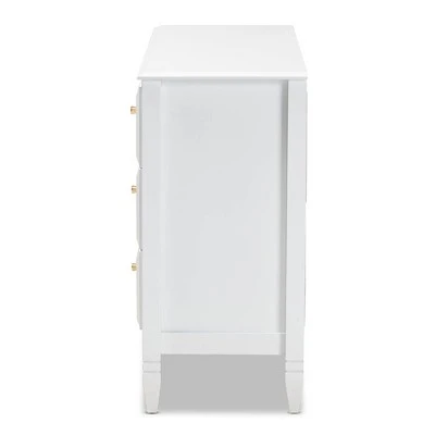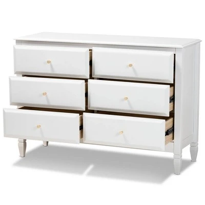 A classic silhouette receives a glamorous update in the Naomi dresser. Made in Malaysia, this wooden dresser displays a polished white finish that brightens any space. The tabletop is well suited for a lamp and trinkets, while six drawers provide ample storage space for clothing and linens. Each drawer is adorned with a striking gold-tone knob that adds a touch of glamour. Inspired by traditional design, the Naomi features tapered feet with recessed detailing. Requiring assembly, the Naomi dresser strikes the optimal balance between classic and contemporary for a look that enhances any bedroom.