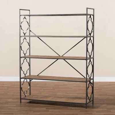 Spacious shelving and exquisite quatrefoil accents make the Mirna bookcase a chic addition to any space. A sturdy black iron metal frame supports five large shelfs crafted from MDF wood, ideal for displaying books, pictures frames, and more. Quatrefoil embellishments on the sides of the bookcase add a decorative touch, while a crisscross stretcher on the back of the bookcase provides structural support. The Mirna bookcase is made in China and requires assembly. Dimensions: 65″ High x 48.8″ Wide x 15.7″ Deep; Shelf: 13.8″ High x 47.2″ Wide x 15.7″ Deep; Legs: 3.1″ High