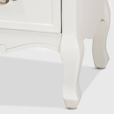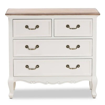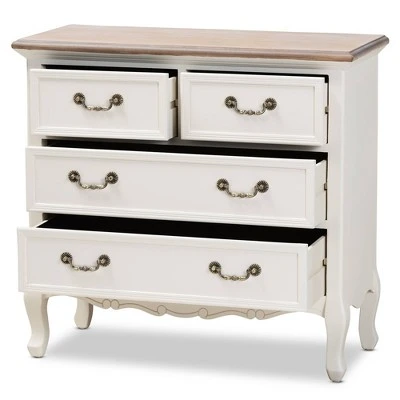 Enhance your bedroom with the charming Amalie dresser. Constructed from wood, this dresser pairs a white-washed oak tabletop with polished white drawers. The tabletop features space to place a lamp and some decorative items, while four drawers offer storage space for clothing and knick-knacks. Each drawer is adorned with molding detailing and an elegant brass metal handle. Inspired by French provincial furniture, the Amalie displays exquisite carvings on the bottom, as well as cabriole legs. The Amalie dresser is made in China and will arrive fully assembled. Dimensions: 29.53″ High x 31.5″ Wide x 13.78″ Deep; Upper Drawers: 11.81″ High x 11.02″ Wide x 4.92″ Deep; Middle Drawer: 25.39″ High x 11.22″ Wide x 4.92″ Deep; Lower Drawer: 25.39″ High x 11.22″ Wide x 4.92″ Deep;