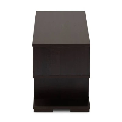 A clean, contemporary design makes the Arne TV stand an easy addition to any living space. Constructed from wood, the Andor features a dark brown finish for a refined look. Six open shelves provide space to display entertainment consoles, DVDs, and more. Each shelf is a different size, giving this piece a cool, modern look. The Arne TV stand is made in Malaysia and requires assembly.