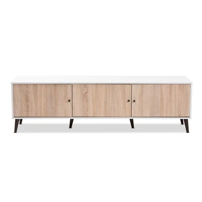 Make the focal point of your livingroom a stylish and organized one with the Bastien TV stand. The solid colors of the TV stand, coupled with the wood grain look of the doors and simple silhouette, are hallmarks of its mid-century modern-inspired design. The stand’s engineered wood frame is built to last. The Bastien features six convenient shelf spaces behind three light oak finished doors. The back panel of the television stand has circular cut-outs for wire management, should you use the shelves to store gaming consoles or media players. The knobs of the Bastien are delightful square knobs finished in a dark brown. The brown-finished legs of the TV stand are angled and tapered, further exemplifying its mid-century modern vibes. The Bastien makes it easy to keep your livingroom or rec room organized and tidy with its sleek look and storage options. Made in Malaysia, the TV stand requires assembly.