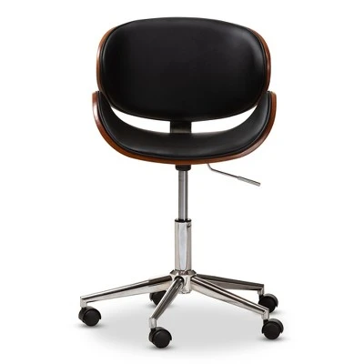 Curved for comfort and styled to impress, the Ambrosio office chair adds character to any workspace. The Ambrosio features 360-degree swivel capability and is height-adjustable to accommodate your needs. The base is constructed from shiny chrome-plated steel and is fitted with casters for swift movement. The uniquely-shaped seat is built from durable plywood and finished with a stunning walnut veneer. Upholstered in a luxurious faux leather, the Ambrosio is padded with foam to provide comfort while you work. The Ambrosio office chair is made in China and requires assembly. Dimensions: 30″ High x 21.06″ Wide x 21.46″ Deep; Adjustable: 35″ High; Seating Dimensions: 25.31″ High (from Floor) x 20.87″ Wide x 15.75″ Deep; Back: 4.69″ High