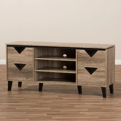 The Beacon media cabinet combines function and modern style. On a geometric silhouette, this oak veneered TV stand features four drawers with black triangle vinyl handles. The angled legs in black, supporting the media cabinet while contrasting with the oak veneered finishing showcase the modern look. Constructed of engineered wood, the TV stand is built to last. The TV cabinet comes with three open shelves with wire management cut-out on the back of the cabinet, enabling the storage of media players, games console and DVD while the drawers can be used as additional storage for controllers, manuals and anything that you would like to store away. The under clearance area allows you to dust as often to keep the area clean. Made in Malaysia, the Beacon TV stand requires assembly.