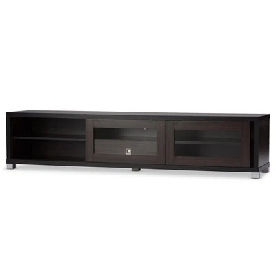 An enviable jewel of home entertainment, Beasley TV Cabinet is a large furniture piece that reflects the beauty and elegance of minimalist contemporary aesthetics. Not only does this entertainment unit look great, but it also comprises functional characteristics to meet the storage expectations of the most demanding homeowners. Featuring a center drawer and open shelf , symmetrically framed by double shelving on each side with sliding doors, Beasley TV Unit is more than suitable to accommodate the storage requirements associated with larger interiors. In addition to its practicality, Beasley TV Unit makes for an exceptional candidate towards creating a sophisticated living room ambience, this piece showcasing the character and charm of an elegant engineered wood construction accentuated by PU veneer finish in dark espresso with silver accents. Made in Malaysia, the TV stand requires assembly.