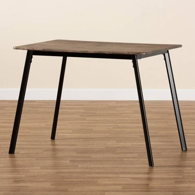 Produce a hearty, warm atmosphere in your space with the robust Calder dining table. Made in China, this table is comprised of a solid metal base topped with a wood tabletop. Slim, angled legs provide excellent stability and support while establishing a mid-century inspired silhouette. Requiring assembly, the Calder features a broad, rectangular shape that comfortably seats up to four. The natural wood grain provides a unique, rugged look, making the Calder dining table an expressive addition to any dining room. Dimensions: 29.72″ High x 39.37″ Wide x 27.56″ Deep;