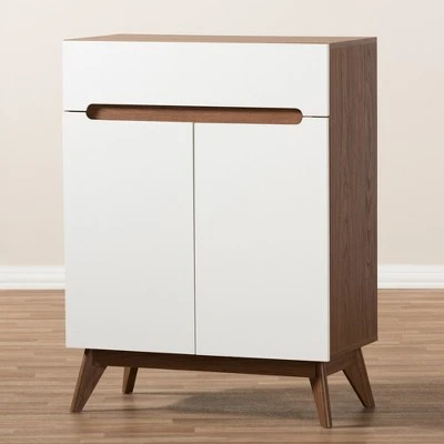 Exude mid-century Scandinavian style in your home with Calypso two-tone two-door shoe cabinet with drawer. Showcasing a sleek and simple design with functionality in mind, the Calypso is constructed of engineered wood in walnut and finishing for lasting good look. Featuring drawer with cut-out handle, contrasting with the walnut wood panels inlaid, the Calypso exudes laid-back luxury and casts a Scandinavian aesthetic over your space. Angular legs complete mid-century look. Pull-out drawer open to reveal ample storage for hats, socks, scarfs, purse and wallets. Made in Malaysia, the Calypso two-door shoe cabinet requires assembly. Dimensions: 42.09″ High x 31.5″ Wide x 15.75″ Deep; Drawers: 3.54″ High x 28″ Wide x 13.18″ Deep; Upper Shelf: 5.43″ High x 30.23″ Wide x 11.8″ Deep; Middle&Lower Shelves: 5.7″ High x 30.23″ Wide x 11.8″ Deep; Legs: 7.68″ High