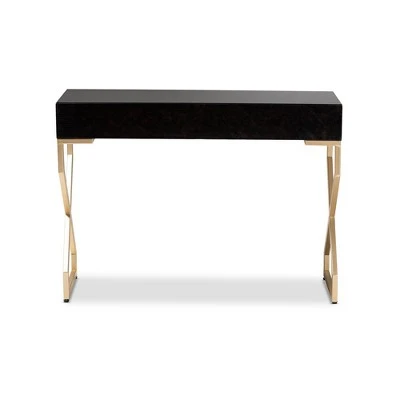 A stunning fusion of faux leather and metal make the Carville console table a unique addition to any space. This MDF wood console is upholstered in cracked faux leather for rugged charm. Two spacious drawers provide room to store phone chargers, bills, and more. A sturdy glass tabletop is equipped with space to display books, decor, and more. The console is supported by a glamorous gold-finished metal frame that contrasts with the aged faux leather for a cool, contemporary feel. Inspired by both modern and ancient design, the Carville features gold-finished drawer handles embellished with the archaic Greek key motif. Place this exceptional piece in the foyer to create an impressive entrance, or place it in the living room to form a striking focal point. The Carville console table is made in China and requires assembly.