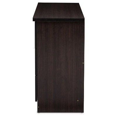 Organize your interior with the Colburn 6-drawer Dark Brown Finish Wood Storage Resort. Its streamlined drawers and table-top offering modern style with minimal fuss. Made from high-density engineered wood boards for long-lasting strength and a sturdy form, with quality runners for smooth functionality. Covered with a espresso brown PU veneer finish for a smooth, stylish and easy-to-maintain surface. Design features six large drawers, each with a metal handle, providing your bedroom with generous clothes or bedding storage space. Simple design lines and dark-wood palate combine to create a traditional piece that works well in a range of different interior styles. Made in Malaysia, the storage dresser requires assembly. Dimensions: 46.8″ High x 15.6″ Wide x 29.64″ Deep; Shelf/Drawer1: 19.96″ High x 12.56″ Wide x 5.75″ Deep