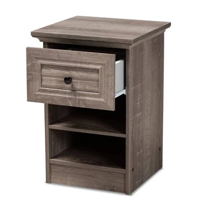Keep your bedside organized in the most elegant way with the Dara nightstand. Constructed from wood, the Dara showcases a clean, streamlined silhouette. One drawer and two shelves provide space to keep all your nighttime essentials close at hand. Its gray and brown oak finish is streaked with white for a subtle rustic look, while a round black knob lends a modern touch. The Dara nightstand is made in Malaysia and requires assembly. Dimensions: 23.5″ high x 15.75″ wide x 15.75″ deep; Drawer dimensions: 4.1″ high x 10.1″ wide x 10.1″ deep; Open shelf: 4.75″ high x 12.4″ wide x 14″ deep;