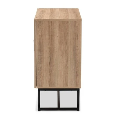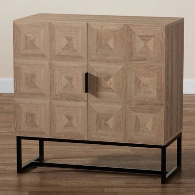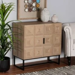 A sleek presentation of modern geometry, the Darien storage cabinet is a refined solution to your household needs. Made in China, this handy piece is comprised of wood frame on top a solid metal base. The doors open to reveal two spacious shelves with plenty of room to organize and declutter busy areas of your home. The Darien requires assembly and showcases a sleek, geometric grain pattern for an added touch of modern charisma. Slim, minimalist door handles complete the look, making the Darien storage cabinet a remarkable addition to any space. Overall Dimensions: 31.50″ High x 31.50″ Wide x 15.70″ Deep; Storage Behind Door(Each): 30.20″ Wide x 15.00″ Deep x 9.20″ High; Table Top: 31.50″ Wide x 15.70″ Deep x 0.60″ Thick; Legs: 7.90″ High;