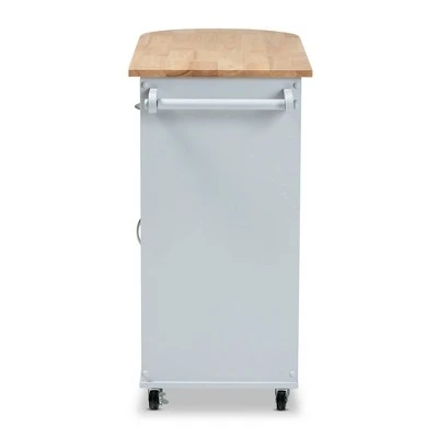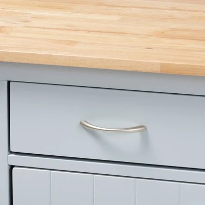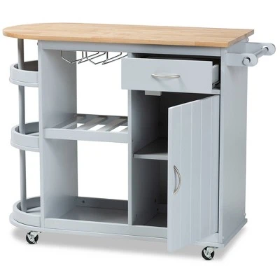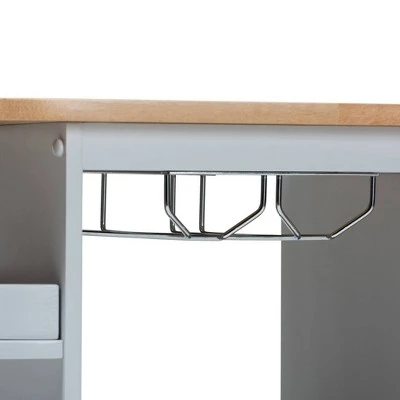 Effectively expand your kitchen’s working surface and storage space with the Donnie kitchen cart. One drawer provides storage for cutlery, while three open shelves provide storage for spices. The drawer and the door open to reveal additional storage space. Designed for both storing and serving, the Donnie is also fitted with a stemware rack and wine bottle holder. Its light gray finish and natural tabletop complement a multitude of kitchen color schemes. The Donnie kitchen cart is made in Malaysia and requires assembly. Dimensions: 37.13″ high x 47.64″ long x 16.54″ wide; legs: 2.52″ high;