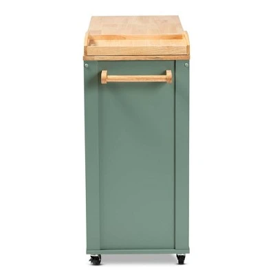 Effectively expand your kitchen’s working surface and storage space with the Dorthy kitchen cart. Showcasing a vibrant two-tone green and natural finish, the Dorthy features four open shelves for spices, plates, and more. Two doors open to reveal additional storage space. An extendable drop leaf tabletop creates extra counterspace , while a detachable tray enables easy serving. Smooth swivel wheels provide swift mobility. The Dorthy kitchen storage cabinet is made in Malaysia and requires assembly. Dimensions: 37.13″ high x 47.64″ long x 16.54″ wide; legs: 2.52″ high;