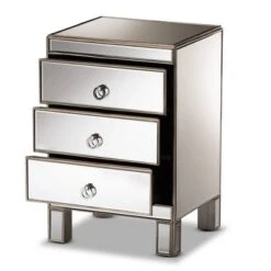 Add a glamorous highlight to your interior with the dazzling design of the Ewan end table. Made in China, the Ewan is comprised of a wood frame encased in lustrous mirrors for a glossy appearance from any angle. Three drawers provide convenient storage for a variety of household essentials, while the square tabletop is well suited to display decorations. Fully assembled, the drawers are adorned with minimalist silver tone metal ring pulls for easy access. Light easily reflects from every surface of the Ewan end table, making it a striking addition to any space. Dimensions: 24″ High x 16″ Wide x 14″ Deep; Drawer: 5.7″ High x 13.5″ Wide x 11″ Deep; Legs: 1.6″ High;