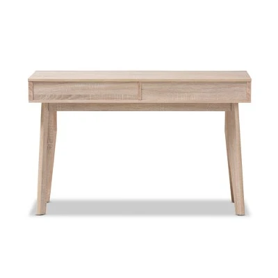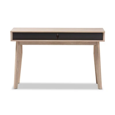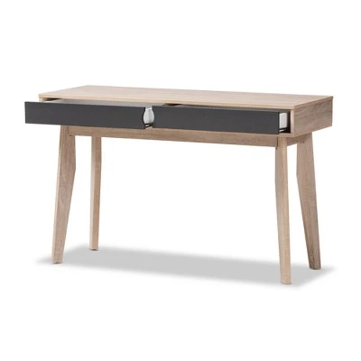A perfect blend of classic and modernity, the Fella collection showcases pattern played with clever balance of colors and sleek surface. Constructed of engineered wood in oak and gray two-tone finishing, the Fella 2-drawer study desk reveals a fresh and relaxing look. Angled legs complements the piece of furniture for superior support and style. Two drawers open to reveal storage room for stationery and books. With practicality, the inset handles in gray wood finish contrasts with the oak surface for a contemporary, Scandinavian aesthetic in your home. Made in Malaysia, the Fella 2-drawer study desk requires assembly.
