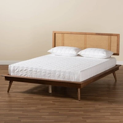 Transform your bedroom environment with the welcoming Nura bed. Made in Malaysia, this bed is crafted from sturdy wood displaying a natural walnut brown finish. The woven synthetic rattan headboard adds an airy, mid-century inspired backdrop to any space. The Nura requires assembly and utilizes wood slats for mattress support, which eliminates the need for a box spring. Angled legs create an expressive outline, distinguishing the Nura bed as a charming and cozy addition to the modern home. Overall Dimensions: 38.78″ High x 60.90″ Wide x 81.30″ Deep; Frame Dimensions: 13″ High x 60.9″ Wide x 81.3″ Deep; Slats: 2.5″ Wide x 55.5″ Long x 0.6″ Thick; Top of Slat: 11.8″ High; Legs: 8.7″ High; Inside Dimensions (Mattress Size): 54″ Wide x 74″ Deep