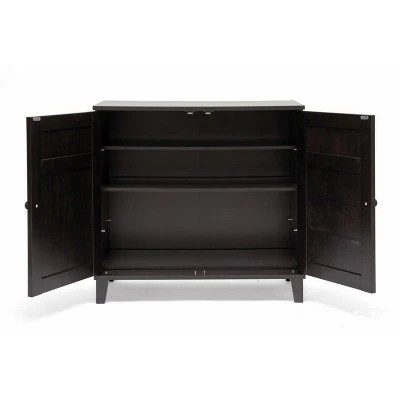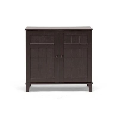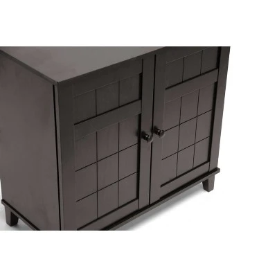 Combining modern and classic elements, our Glidden Designer Shoe Cabinet unobtrusively tucks away shoes yet keeps them close at hand for a quick walk with the dog or trip to the office. This contemporary shoe storage option is made of MDF and engineered wood with faux wood grain paper veneer: it’s so stylish you’d never guess shoes are inside. Four fixed-height horizontal shelves behind the cabinet doors are ideal for adult and children’s shoes alike, though boots are not recommended. Malaysian-made, this designer shoe cabinet requires assembly and should be wiped clean with a dry cloth. For those with more storage needs, a taller version of the Glidden Shoe Cabinet is also available (sold separately). Overall Dimensions: 28 inches high x 29.1 inches wide x 15.1 inches deep Overall Dimensions: 28 inches high x 29.1 inches wide x 15.1 inches deep