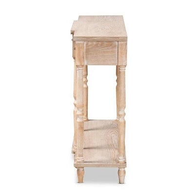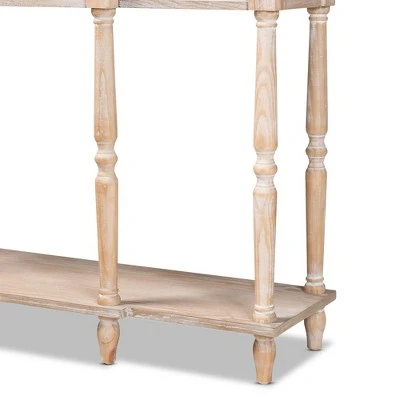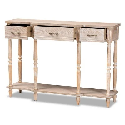 Revitalize your entryway with the elegant and efficient Hallan console table. Made in China, this wood console is finished in a whitewashed oak brown that lends rustic, old world appeal. Three drawers and a lower shelf provide space to store mail and display decor. Crisp lines lend contemporary style, while ring turned legs add a traditional look. The Hallan requires assembly and is accented with antique gold tone metal drawer pulls for a touch of vintage charm. With plenty of surface area for storage and decorations, the Hallan console table is a fantastic addition to any entryway.