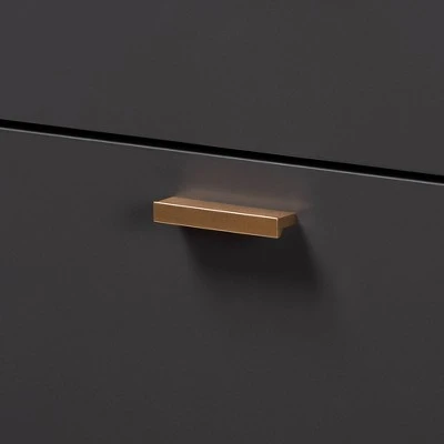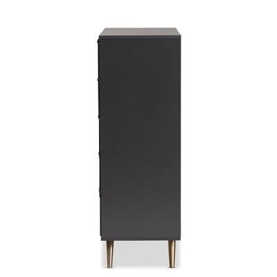 A tasteful expression of modern minimalism, the Kelson chest is an impressive solution to bedroom storage. Made in Malaysia, the sturdy wood frame of the Kelson showcases a dark Gray finish that exudes a cool, contemporary character. Five spacious drawers coordinate busy rooms with abundant storage space for clothes, linens, and more. Requiring assembly, the Kelson utilizes gold-tone angled legs for stable support with a luxurious touch. Gold handles add an eye-catching touch, making the Kelson chest a refreshing addition to any space. Dimensions: 46.1″ High x 32.5″ Wide x 15.75″ Deep; Drawer Dimensions: 3.6″ High x 28″ Wide x 12.1″ Deep; Legs: 5.9″ High;
