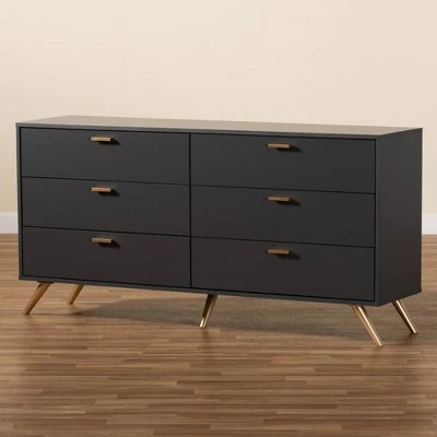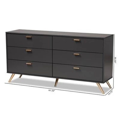 A tasteful expression of modern minimalism, the Kelson dresser is an impressive solution to bedroom storage. Made in Malaysia, the sturdy wood frame of the Kelson showcases a dark gray finish that exudes a cool, contemporary character. Six spacious drawers coordinate busy rooms with abundant storage space for clothes, linens, and more. Requiring assembly, the Kelson utilizes gold-tone angled legs for stable support with a luxurious touch. Gold handles add an eye-catching touch, making the Kelson dresser a refreshing addition to any space. Dimensions: 30.5″ High x 61.5″ Wide x 15.75″ Deep; Drawer Dimensions: 3.6″ High x 27.75″ Wide x 12.1″ Deep; Legs: 5.9″ High;