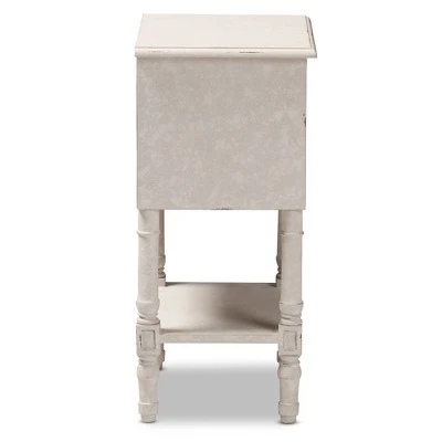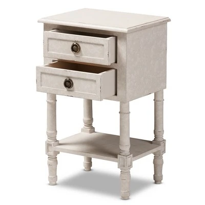 The Lenore 2-drawer nightstand will add an element of romance to your bedside with its ornate ball-turned details and refreshing whitewashed finish. The country cottage and farmhouse-inspired design is evident in the amount of detail put into this nightstand. The Lenore features two pull-out drawers and one bottom shelf for convenience. Charming, bronze finished drawer pulls give the nightstand a bit of antique style. The Noemie is easy to coordinate with a wide range of styles, including French, rustic, farmhouse, and provincial-inspired decor. Add the Lenore to your guest room to devisitors, or keep it for yourself in your own bedroom. Made in Indonesia, the nightstand requires assembly. Dimensions: 25.59″ High x 15.75″ Wide x 11.81″ Deep; Drawer: 3.94″ High x 10.43″ Wide x 9.84″ Deep; Shelf: 8.46″ High x 14.57″ Wide x 11.02″ Deep; Legs: 5.71″ High