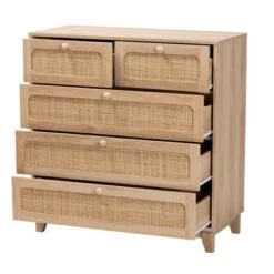 Elsbeth Wood And Natural Rattan 5 Drawer Storage Cabinet Oak Brown/Natural Brown – Baxton Studio