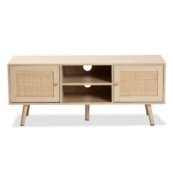 Sebille Wood With Natural Rattan 2 Door TV Stand For TVs Up To 45″ Light Brown – Baxton Studio