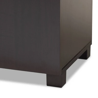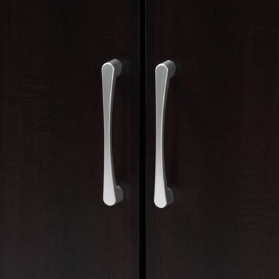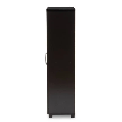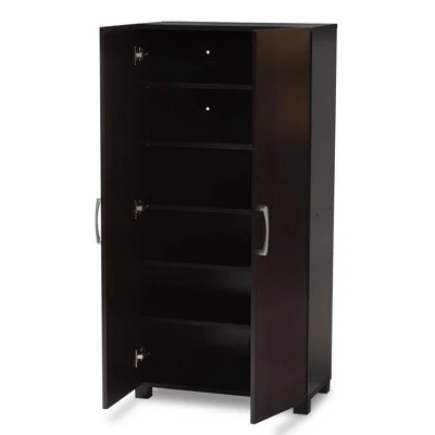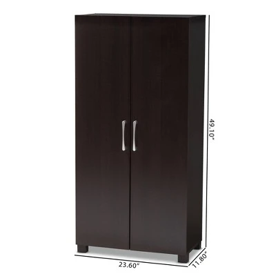 Stylish and compact, the Marine cabinet is the solution to efficient shoe storage. Constructed from engineered wood, the Marine showcases an elegant wenge finish. Two doors conceal six shelves with storage space for up to 12 pairs of shoes. Circular cut-outs on the back of the cabinet enable air circulation and prevent mold growth on your shoes. Silver PVC door handles and PVC legs complete the look. The Marine cabinet is made in Malaysia and requires assembly.