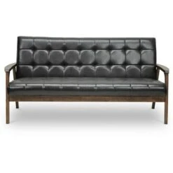 Declare your allegiance to timelessness with our Mid-Century Masterpieces Sofa. Inspired by mid-century style, our modern sofa nods to the past with a foot firmly entrenched in the present. Medium wood veneer finish and a faux leather foam-cushioned seat seamlessly combine comfort and style. Dimensions: 30.63″ High x 63.75″ Wide x 27.00″ Long; Seating Dimensions: 16.00″ High (from Floor) x 58.50″ Wide x 21.00″ Long; Arm Height (from Seat): 5.50″ High; Height from Floor to Top of Arms: 20.13″ High