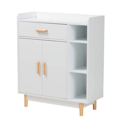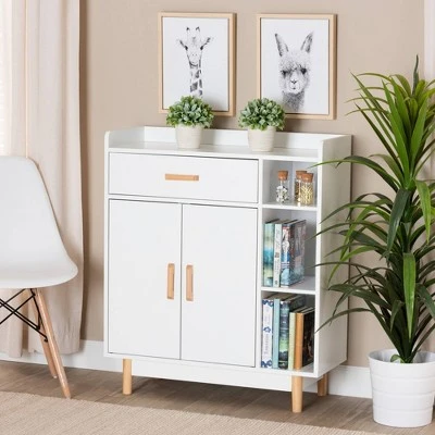 Implement an atmosphere of clean serenity in your dining space with the delightful efficiency of the Russell sideboard. Made in China, this lovely storage cabinet embraces the flair of mid-century design with a sturdy wood frame adorned with pine wood embellishments. Two interior shelves and one drawer provide superb storage for cookware, while three open shelves create a stunning diplsay for ingredients and decorative items. The Russell requires assembly and features raised tabletop borders to give this credenza a visually impressive and secure work space. Exhibiting an attitude of cleanliness and grace, the Russell sideboard elevates any arrangement. Overall Dimensions: 31.50″ W x 12.60″ D x 36.60″ H; Drawer(s): 21.90″ W x 12.60″ D x 5.90″ H; Left Shelf Space Behind Door(Each): 21.90″ W x 12.60″ D x 21.90″ H; Top Smaller Open Shelf: 7.70″ W x 12.60″ D x 5.90″ H; Bigger Open Shelf (Each): 7.70″ W x 12.60″ D x 10.60″ H; Legs: 5.10″ H;