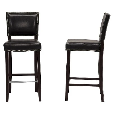 Our Aries Designer Bar Stool looks right at home next to a modern kitchen counter or contemporary bar. Bring this beauty home and you will enjoy sleek black faux leather, a dark brown solid rubber wood frame, convenient stainless steel foot rest, and non-marking feet. Foam cushioning with iron springs offer ample support and comfort. Silver nail head trim completes this Malaysian-made contemporary bar chair. To clean, wipe with a damp cloth. The Aries Stool requires assembly with use of a rubber mallet. Brown and White faux leather options are also available (sold separately). 18.5”WX22”DX44.5”H