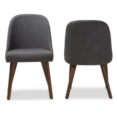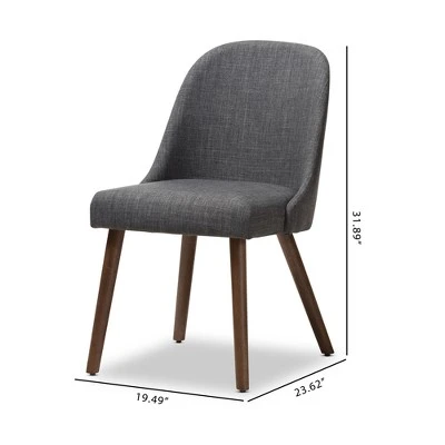 The gentle curves and minimalist style of the Cody dining chair make it easy to coordinate in casual and formal settings. The chair’s mid-century modern-inspired design is apparent in the curved, slightly arched chair back. The Cody’s frame and legs built of solid, walnut-finished rubber wood to last. The chair features chic, fabric upholstery and a comfortable, foam-padded seat. Angled, tapered legs give the Cody a graceful and retro look. This chair will add a touch of modern flair to your dining room, living room, or any other shared spaces. Made in Malaysia, the Cody requires assembly. Dimensions: 31.89″ High x 19.49″ Wide x 23.62″ Deep; Seating Dimensions: 18.7″ High (from Floor) x 18.31″ Wide x 18.11″ Deep; Back: 13.19″ High; Legs: 14.57″ High