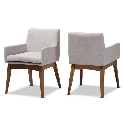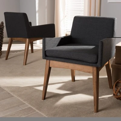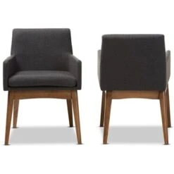 Enriched with finer detailing, the angular and cushioned Nexus dining armchair embraces comfort. Constructed of solid rubberwood frame in walnut finishing, the Nexus is upholstered in polyester fabric. It’s splayed leg design sets the stage for a mid-century modern appeal to your dining room. Comfortable foam padded seat and back for lasting comfort in enjoying everyday family dinners. Medium seat back that seamlessly tapers down creates a look of modern aesthetic. Made in Malaysia, the Nexus dining armchair requires assembly. Dimensions: 29.92″ High x 21.46″ Wide x 23.03″ Deep; Seating Dimensions: 17.91″ High (from Floor) x 18.9″ Wide x 16.54″ Deep; Arm Height: 4.92″ High; Height (from Floor to Top of Arms): 23.03″ High; Back: 14.37″ High; Legs: 14.96″ High