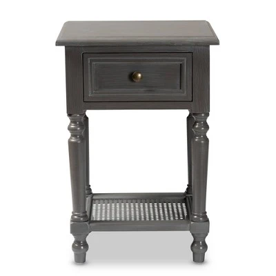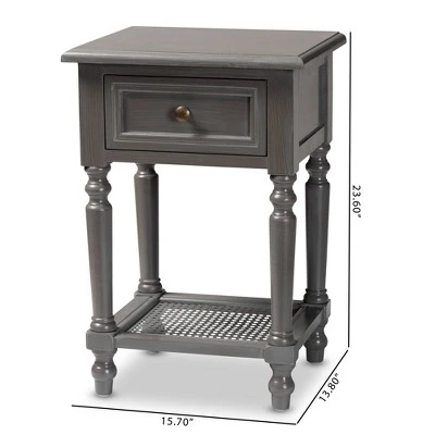 Accommodate your household needs with the timeless design of the Mahoney end table. Made in China, this end table is crafted from sturdy wood with a neutral gray finish that blends well with modern spaces. One drawer offers secure storage for household essentials, while the woven synthetic rattan shelf creates a convenient display for larger items. Requiring assembly, the Mahoney is supported by ring-turned legs for stable support that lends a sophisticated feel. An antique brass finished metal drawer knob adds a vintage touch, making the Mahoney end table a simple yet classy addition to any space. Dimensions: 23.60″ High x 15.70″ Wide x 13.80″ Deep; Drawer Dimensions: 4.70″ High x 11.00″ Wide x 10.40″ Deep; Shelf Dimensions: 11.20″ High x 13.80″ Wide x 12.60″ Deep; Legs: 3.3″High;