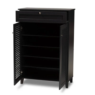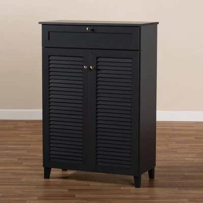 Store your shoes on the sly with the Coolidge shoe cabinet. Two slatted doors, fitted with round knobs, conceal five shelves with storage space for up to 15 pairs of shoes. One spacious drawer, accented with inset paneling, provides additional storage space for extra shoelaces and miscellaneous items. Tapered legs add refined style and provide elevation to deter dust buildup. Constructed from engineered wood, the Coolidge showcases a sleek dark gray finish that complements any color scheme. The Coolidge shoe cabinet is made in Malaysia and requires assembly. Dimensions: 45.3″ High x 30.7″ Wide x 14.6″ Deep; Drawer: 5.51″ High x 28.43″ Wide x 13.78″ Deep; Shelves: 5.7″ High x 28.3″ Wide x 11.4″ Deep; Legs: 3.5″ High