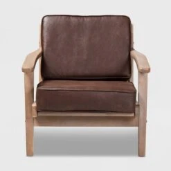 Create a cozy, retro reading alcove in your living space with the Sigrid armchair. Featuring a low profile and wide, angular frame, the Sigrid displays all the hallmarks of mid-century design. The seat and back are upholstered in a sleek dark brown faux leather effect fabric that complements the antique oak finish on the solid rubberwood frame. Its thick, foam-padded cushions provide comfort for years to come. Striking from any angle, the Sigrid is well suited for both private residences and public office spaces. The Sigrid armchair is made in Malaysia and requires assembly. Dimensions: 29.13″ high x 29.33″ wide x 36.02″ deep; Seating dimensions: 22.83″ wide x 21.65″ deep x 16.34″ high (from Floor); Arm height: 21.06″ high; Back: 15.35″ high; Legs: 10.63″ high;