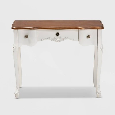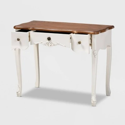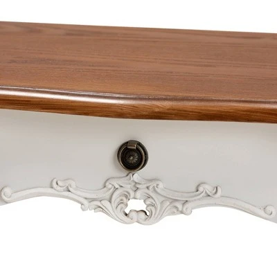 Display your favorite pieces of decor on the charming Sophie console table. Constructed from wood, the Sophie features three drawers with space to store keys, bills, and more. Its classic white finish complements the brown wood tabletop and highlights the stunning attention to detail in the floral moldings. Carved brass knobs and cabriole legs add a delightful French-inspired look. This versatile piece is well suited for use in an entryway, hallway, or living room. The Sophie console table is made in China and requires assembly. Dimensions: 29.92″ high x 47.64″ wide x 18.5″ deep; Side drawers dimensions: 5.91″ high x 11.02″ wide x 14.96″ deep; Middle drawer: 5.91″ high x 15.75″ wide x 14.96″ deep; Legs: 29.13″ high;