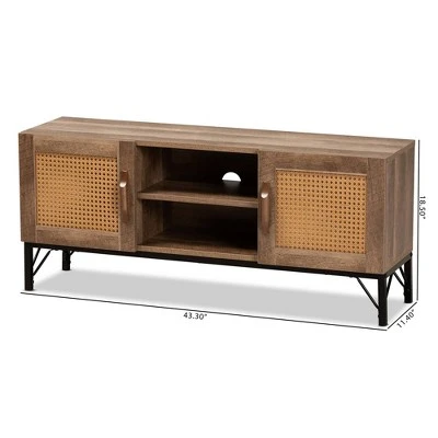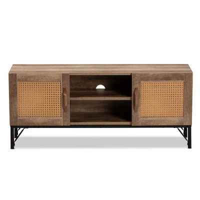Grace your living room with the charming, Bohemian aesthetics of the Veanna TV stand. Made in China, this stunning piece combines synthetic rattan accents with a sturdy wood and metal frame for a tranquil, carefree display that exudes warmth. Two open shelves create a convenient display for media devices, while two additional shelves behind the doors offer secure storage space. Requiring assembly, the Veanna features a cord management hole on its back panel for quick and easy setup. An outstanding focal point with ample storage potential, the Veanna TV stand is a stylish solution to media organization.